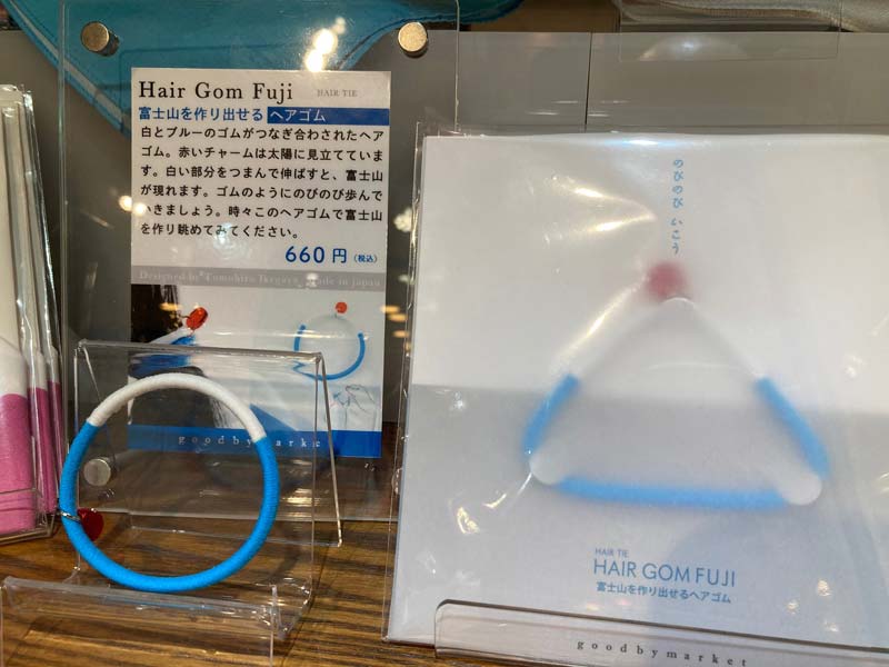 白とブルーのヘアゴムとなります。白い部分をつまんで伸ばすと、なんと富士山がっ!。
